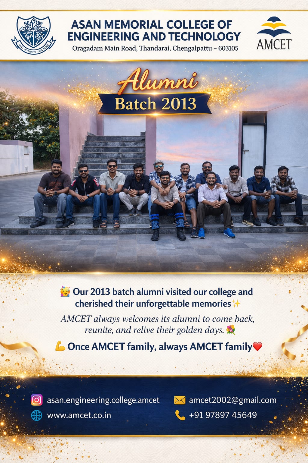 Asan Memorial College of Engineering and Technology (AMCET), Chengalpet was established in 2002 under the Asan Memorial Institution. The college campus spans 45 acres of pollution-free land, set against picturesque hills and valleys, creating an ideal environment for learning and living.