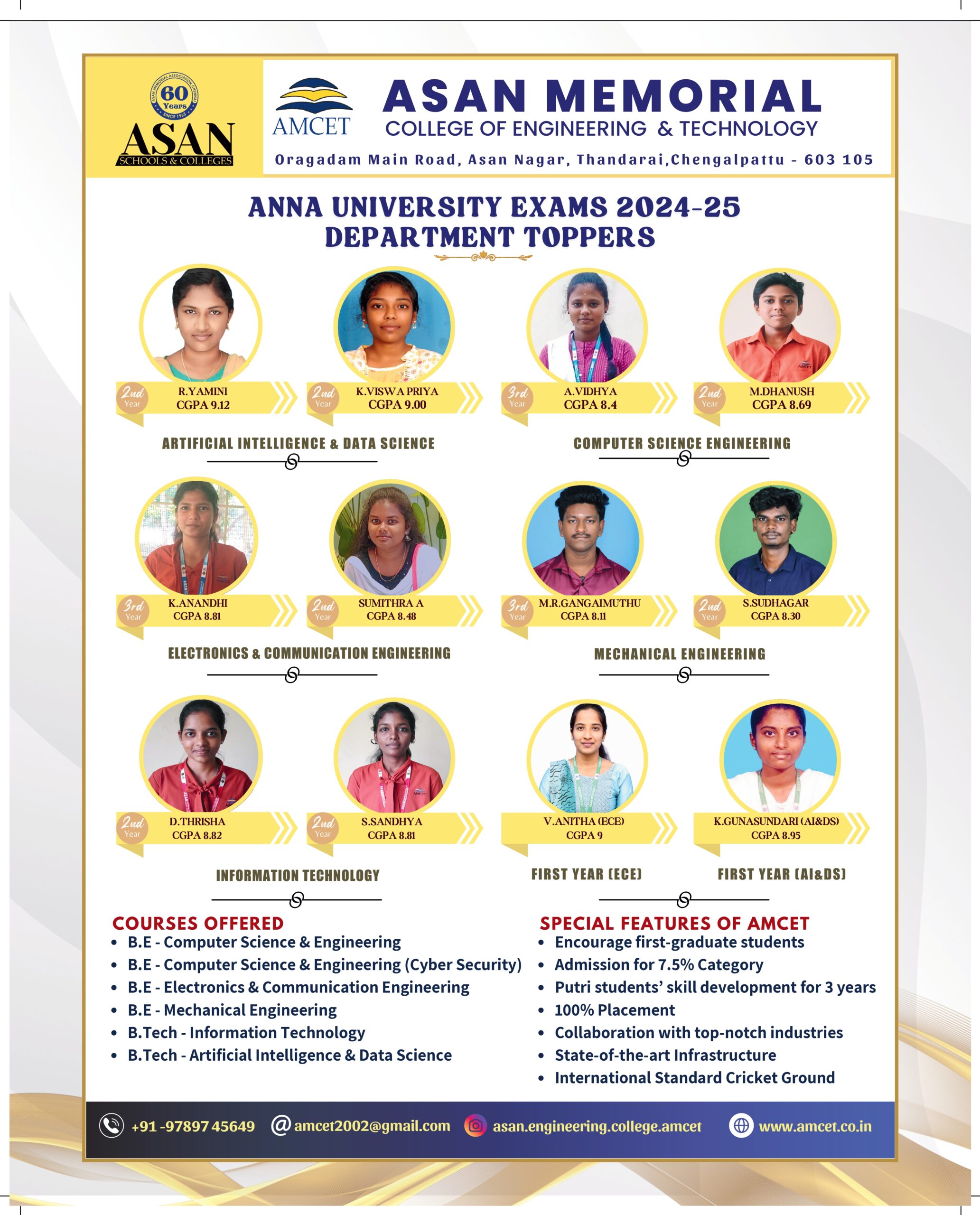 We are proud to announce the academic excellence of our students who have topped their respective departments in the Anna University examination 2024-2025. Their hard work, dedication and commitment to academic excellence have brought laurels to AMCET.